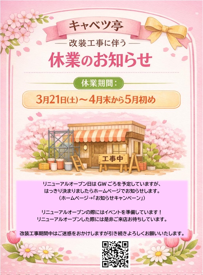 毎度ご来店ありがとうございます。 3/21から1ヶ月ほど改装のためにおやすみします。改装期間中はご迷惑をおかけしますが、何卒宜しくお願いします。